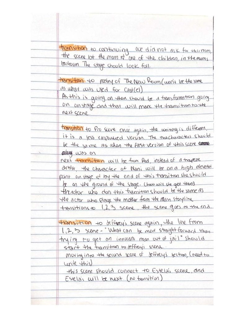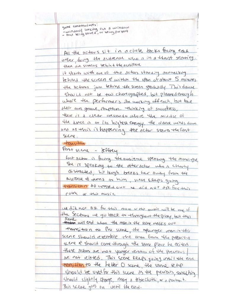 After reading published works, I went back to the prompts and used those already written pieces as a foundation for the play. I kept them all in a google drive folder and tried to string them together. Some writing went through more changes than others as I was trying to have them all meet at a point of even slight connection. I didn’t put so much pressure on having things make sense with each, but as long as they had one point that could link the two stories, I kept it in the play. Some of the prompts were writing something based on the color red, or writing something with the letter “o” in it. They were general enough to give me liberty to get as creative as I wanted. These two prompts informed two of my favorite scenes of the piece- the red prompt became the first instance of connection we see between the characters and the letter “o” prompt became a scene about intergenerational responsibility through a mom/daughter relationship.